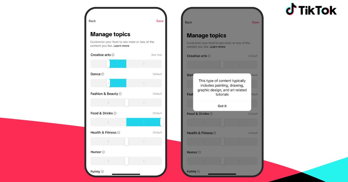 The settings “will not completely eliminate topics, but it can affect that they are recommended over time, with the evolution of your interests.” Once you adjust them, Totok says “it may take some time” to implement the changes. Adopt the topics just affects the videos you have shown for your feed – nowhere on the platform.